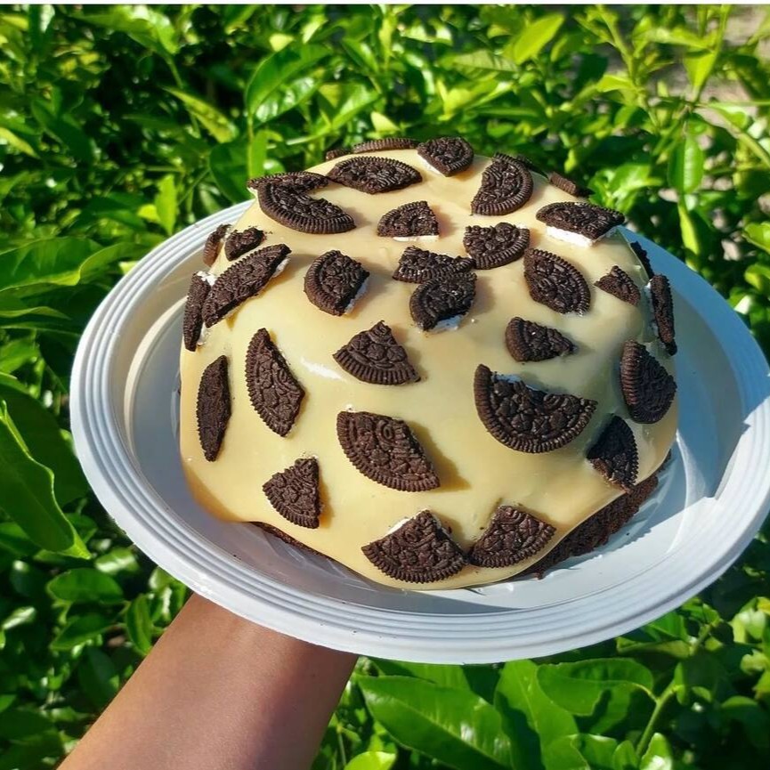 Massa de chocolate com cobertura de Ninho finalizado com biscoitos Oreo.
