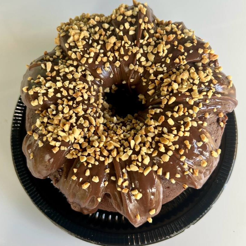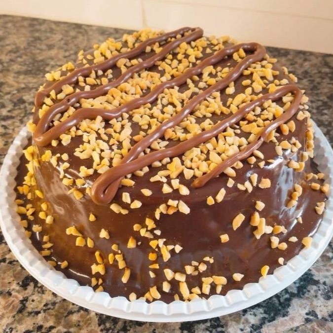 Massa fofinha de chocolate, com cobertura de brigadeiro chocolate cremoso 50% cacau finalizado com amendoim triturado.