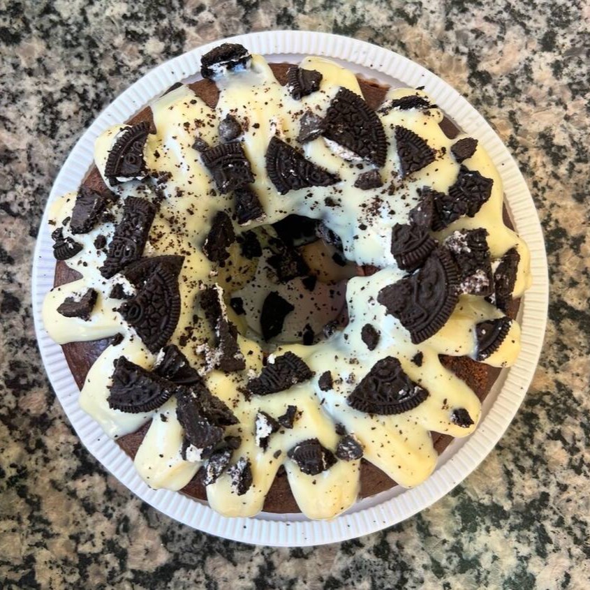 Massa fofinha de Oreo, com cobertura de brigadeiro branco e pedaços de Oreo!