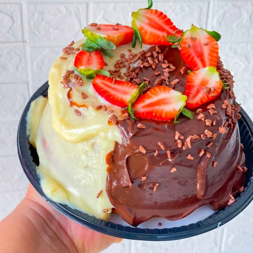 Massa branca, cobertura de brigadeiro de 50% cacau e cobertura de Ninho.