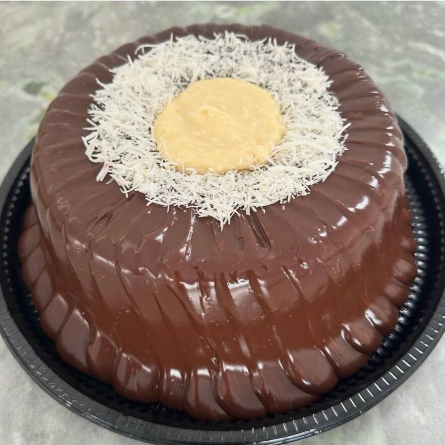 Massa de chocolate com recheio de coco, e cobertura de chocolate.