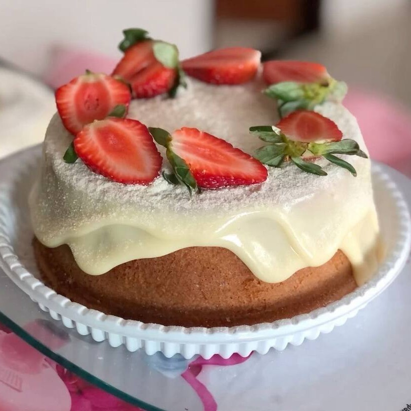 Massa fofinha de Ninho com cobertura cremosa de Ninho e morangos picados