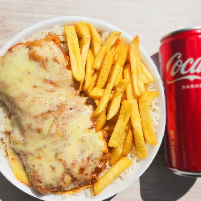 Filé de Frango empanado na farinha panko e gratinado com queijo, acompanha arroz branco soltinho, feijão, batata frita e refrigerante pet Coca-Cola Zero sem açúcar bem gelada. Marmita indicada para 01 pessoa. Serve até 1 pessoa (aprox.400g)