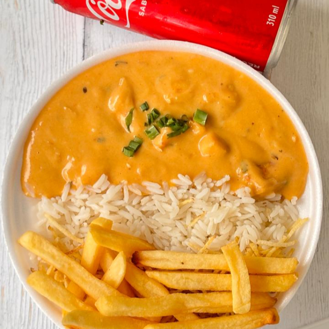 Marmita com delicioso peito de frango suculento, com molho cremoso, acompanhado de arroz branco e batatas fritas.. Acompanha refrigerante lata Coca Cola 310ml bem gelada. Marmita indicada para 01 pessoa.