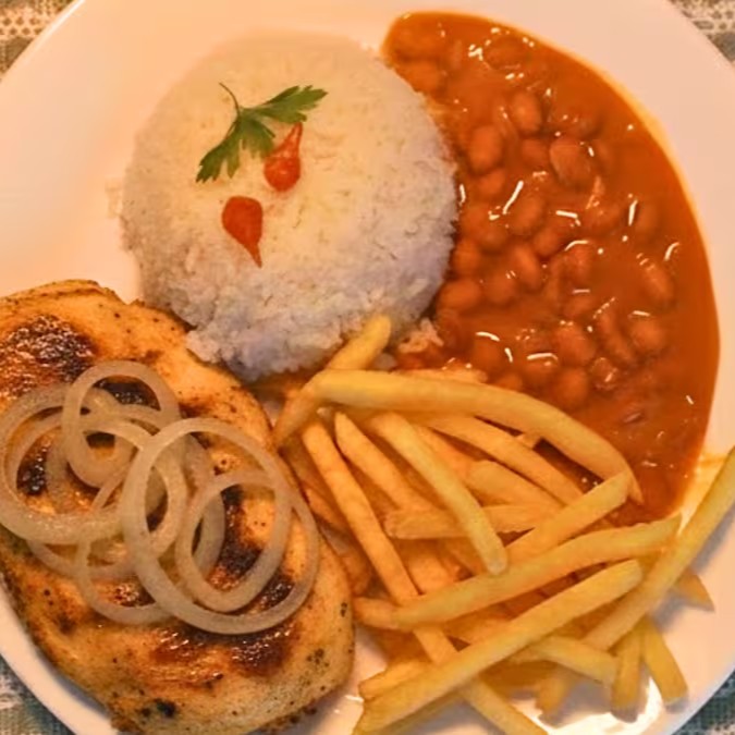 Uma refeição completa e caprichada: arroz soltinho, feijão temperado, bife de frango grelhado no ponto, acompanhado de salada variada e batata frita crocante — ambos enviados em porções separadas para manter a qualidade e a crocância. Sabor caseiro e bem servido!
