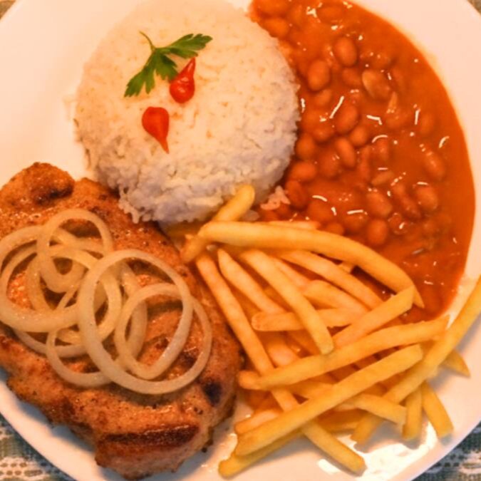 Um prato completo e saboroso: arroz branco soltinho, feijão temperado, bife de porco suculento grelhado, salada variada fresquinha e uma porção de batata frita crocante - ambos enviados em porções separadas para manter a qualidade e a crocância. A refeição perfeita para matar a fome com sabor caseiro e qualidade.