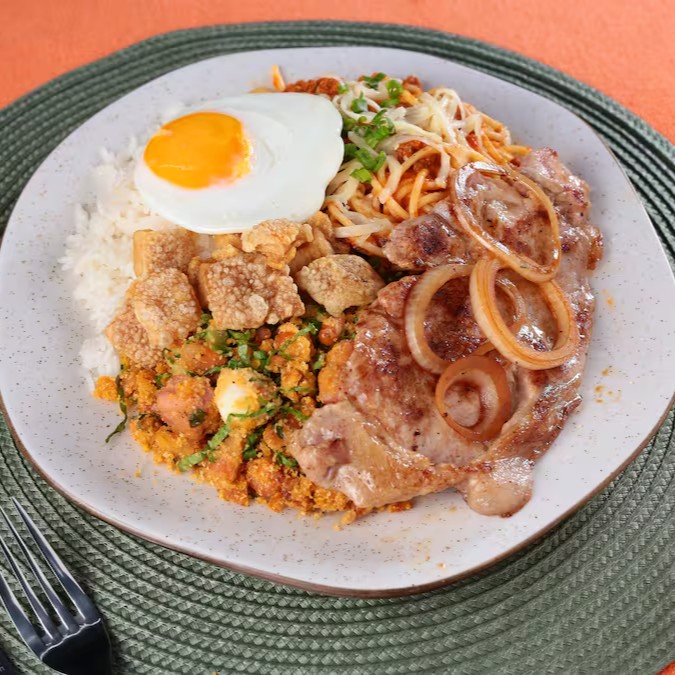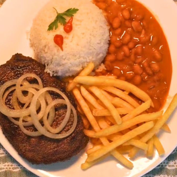 Um banquete completo no prato: arroz soltinho, feijão tropeiro à moda da casa, espaguete à bolonhesa com muçarela derretida, um ovo frito com gema ao ponto e um bife grelhado a sua escolha. Finalizado com torresmo crocante separadamente. Para quem quer tudo e bem servido.