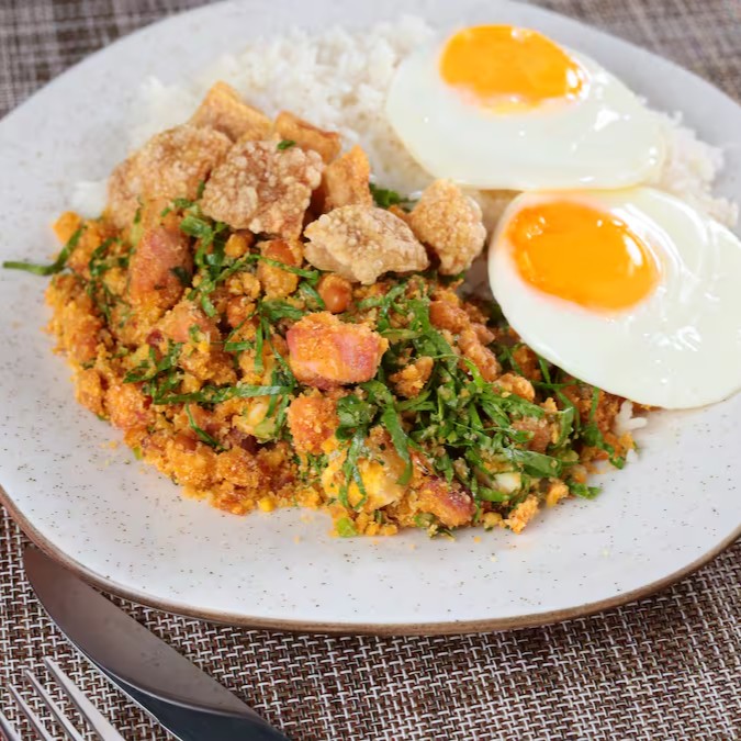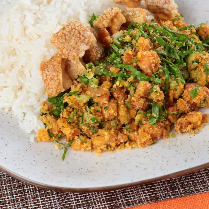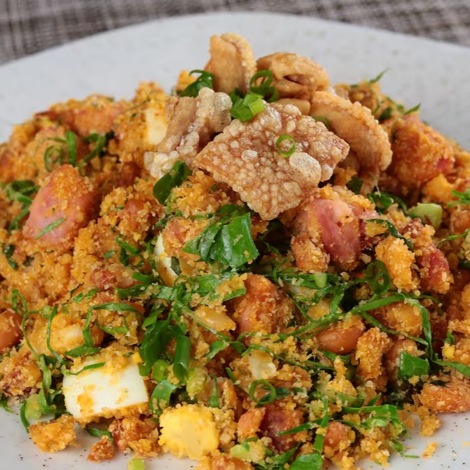 Uma deliciosa combinação de arroz soltinho, misturado com feijão tropeiro no estilo caseiro, com bacon macio e suculento, linguiça picadinha, ovos cozidos, couve e cheiro verde. O prato ganha brilho especial com dois ovos fritos com gemas ao ponto, servidos por cima, e finalizado com torresmo crocante à parte, para completar a experiência.