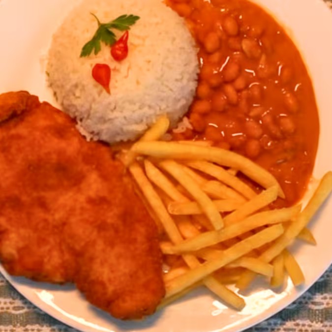 Um prato completo e irresistível: arroz soltinho, feijão temperado e um frango empanado bem crocante, acompanhado de salada variada fresquinha e batata frita crocante — ambos enviados em porções separadas para manter a qualidade. Sabor caseiro e bem servido!