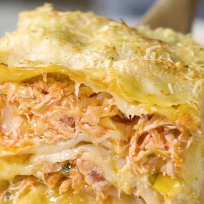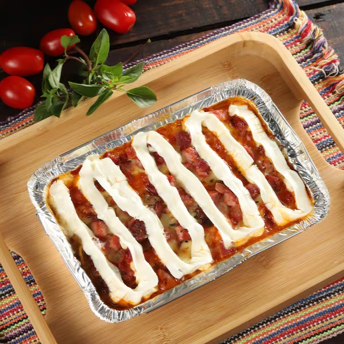 Massa de espaguete, molho á bolonhesa, frango desfiado, bacon, milho, Catupiry, mussarela gratinada e orégano