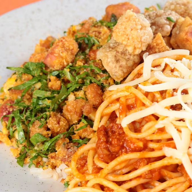 Macarrão espaguete, servido com um molho bolonhesa artesanal da casa, muçarela, feijão tropeiro no estilo caseiro, com bacon macio e suculento, linguiça picadinha, ovos cozidos, couve e cheiro verde. Finalizado com torresmo crocante separadamente.