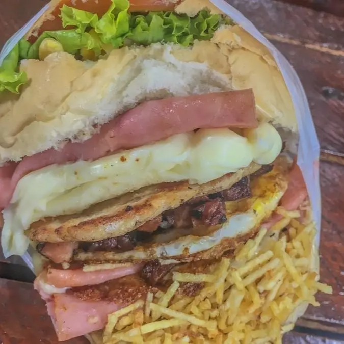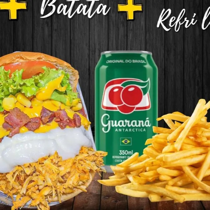 Descubra o poderoso 'Vem Monstro', uma oferta imperdível da nossa categoria 'Promoções e Combos'. Este robusto sanduíche é composto por um pão macio que envolve dois hambúrgueres tradicionais de 90gr de carne bovina suculenta, complementados por ovos frescos, duas fatias de presunto, duas de mozarela derretida, grãos de milho crocantes, bacon crocante, cremoso Catupiry, alface crocante, tomates frescos, batata palha crocante e um molho especial. Além disso, o combo inclui uma generosa porção de batatas fritas douradas e crocantes e uma lata de refrigerante para completar esta festa de sabores. Desperte o monstro da fome que há em você!