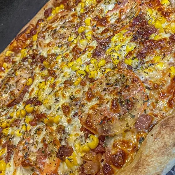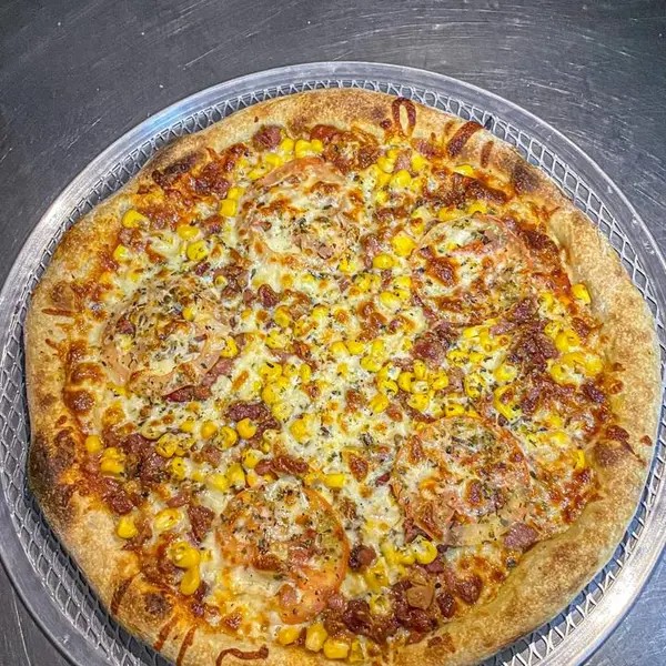 Molho Sugo, muçarela, tomate, milho, bacon, azeitona e oregano
