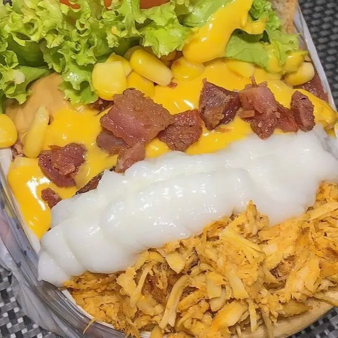A 'Crazy Batata com Cheddar e Bacon' é uma entrada irresistível! Com aproximadamente 350g, essa batata é cozida à perfeição e revestida com uma generosa camada de cheddar cremoso. Para completar, pedaços de bacon crocantes são cuidadosamente distribuídos, trazendo um toque defumado que se equilibra perfeitamente com o sabor acentuado do queijo. Esta deliciosa combinação resulta numa experiência culinária verdadeiramente tentadora e gratificante. Um deleite que vai abrir o seu apetite!
