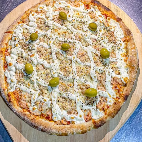Massa tradicional, molho sugo, muçarela, frango desfiado, requeijão cremoso, orégano e azeitona
