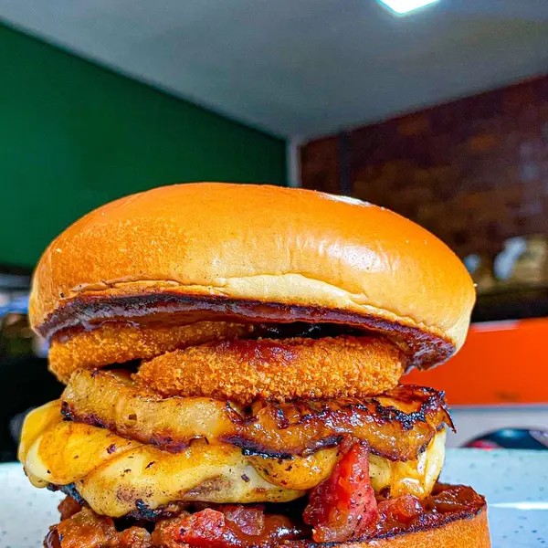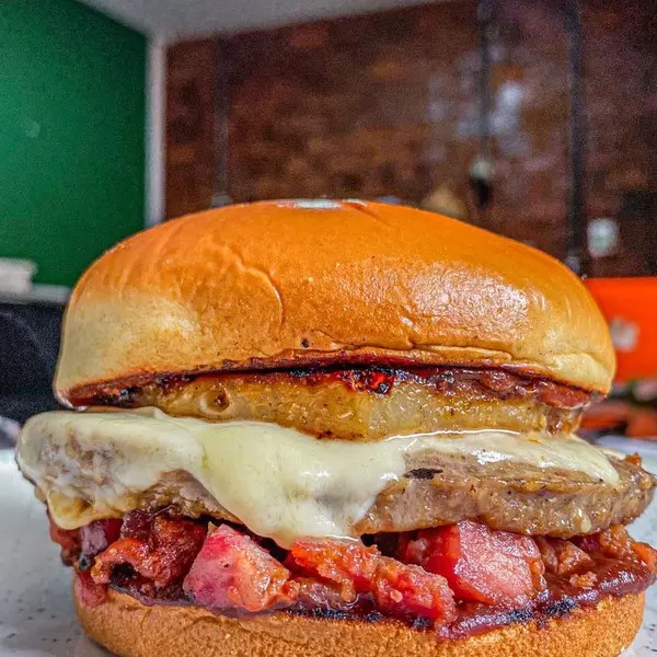 Pão, carne bovina tradicional, queijo mussarela, uma fatia de abacaxi grelhado na chapa, bacon e molho barbecue