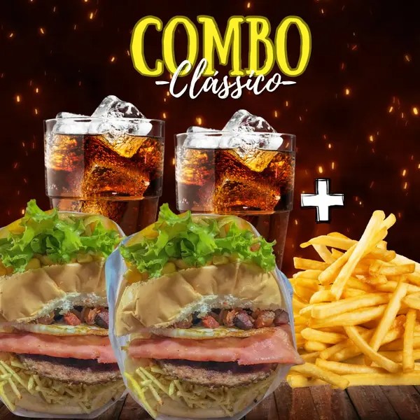 Introduzindo o 'Combo 2 Clássico', uma estrela na nossa seção 'Promoções e Combos'. Com um hambúrguer generoso de 90g, feito com carne bovina meticulosamente selecionada e aninhado em um pão externamente crocante e internamente macio. Enaltecendo a refeição estão ingredientes premium: bacon crocante e intensamente saboroso, mussarela derretida na perfeição, e presunto que traz um harmonioso toque salgado. O ovo frito de gema macia e o queijo Catupiry cremoso se fundem, criando uma textura suave e rica. O milho confere um doce contraste, enquanto a batata palha adiciona uma textura crocante extra. Alface e tomate frescos oferecem um equilíbrio de sabor, com um molho secreto irresistivelmente tangente como toque final. O combo é completado por batatas fritas crocantes e um refrescante refrigerante de 1l. Uma experiência culinária para deleitar e encantar!
