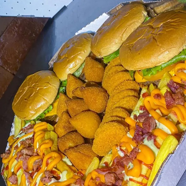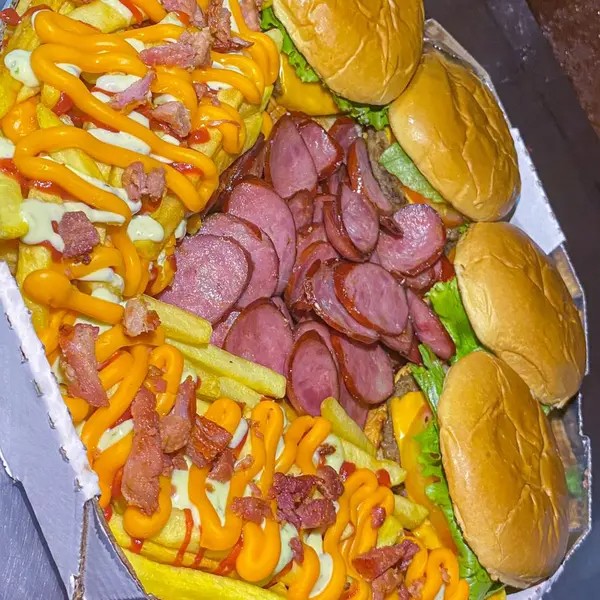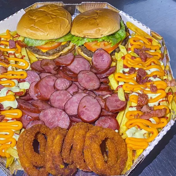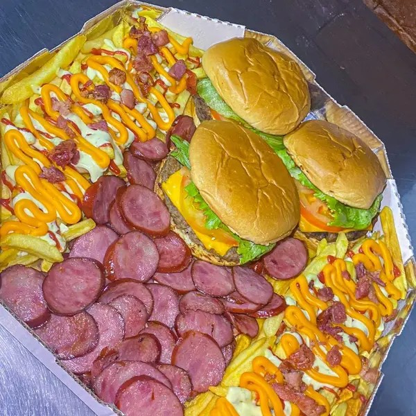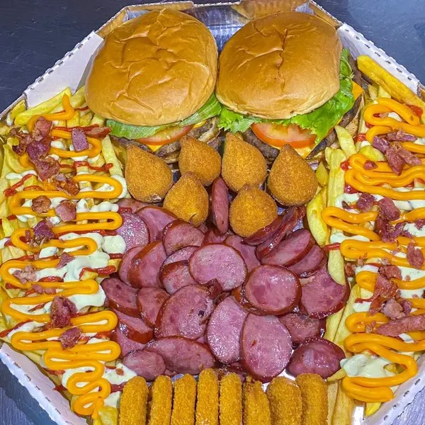 2 crazy salada ( pão brioche, carne de boi tradicional 90gr, alface, tomate e molho) aproximadamente 500gr de batata com ketchup, molho da casa e cheddar e bacon, 8 nuggets, 6 coxinha e calabresa