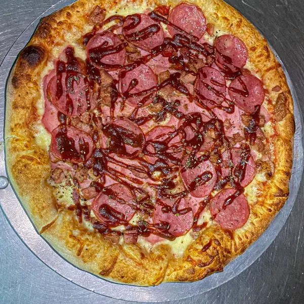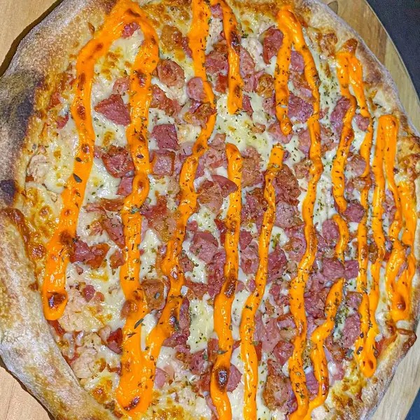 Massa tradicional, molho sugo, muçarela, presunto, calabresa, bacon, , azeitona e orégano