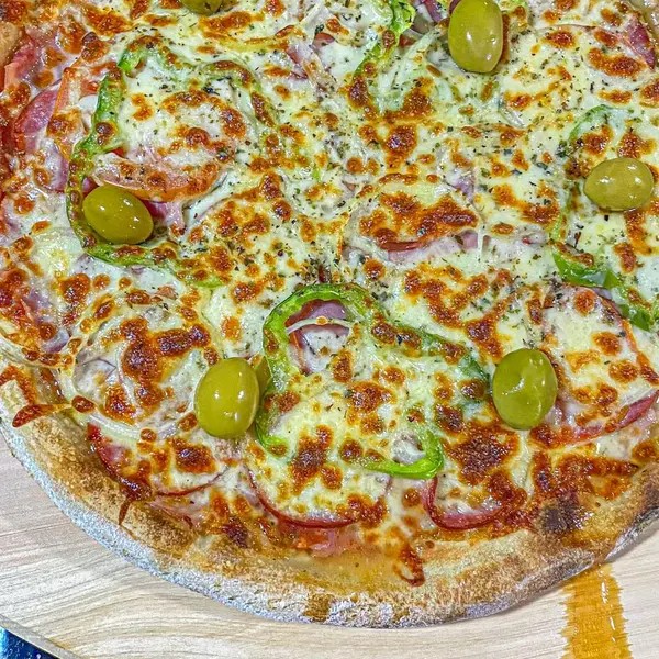 Massa tradicional, molho sugo, muçarela, presunto, calabresa, pimentão, cebola, azeitona e orégano