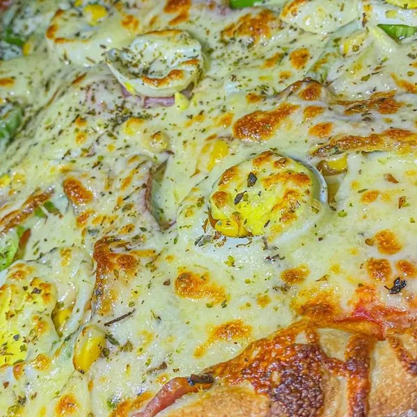 Massa tradicional, molho sugo, muçarela, presunto, tomate, milho, bacon, ovos, cebola, azeitona e orégano