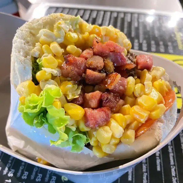 Pão, carne tradicional de boi 90gr, queijo, bacon, salada, milho e molho