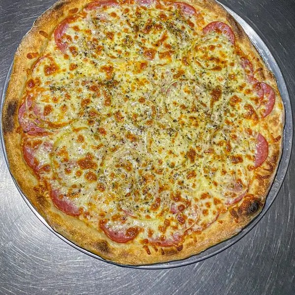 Massa tradicional, molho sugo, muçarela, calabresa, cebola, orégano e azeitona