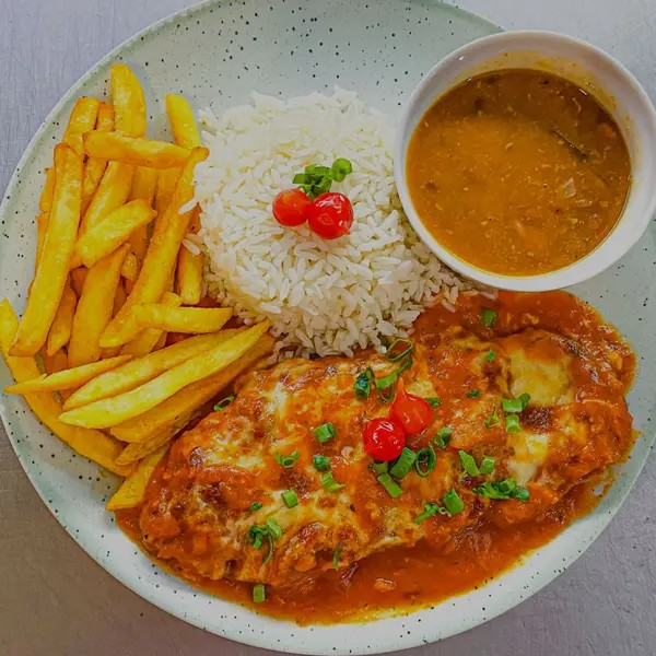 Parmegiana de Frango , arroz , feijão , batata frita , cebolinha e pimenta biquinho