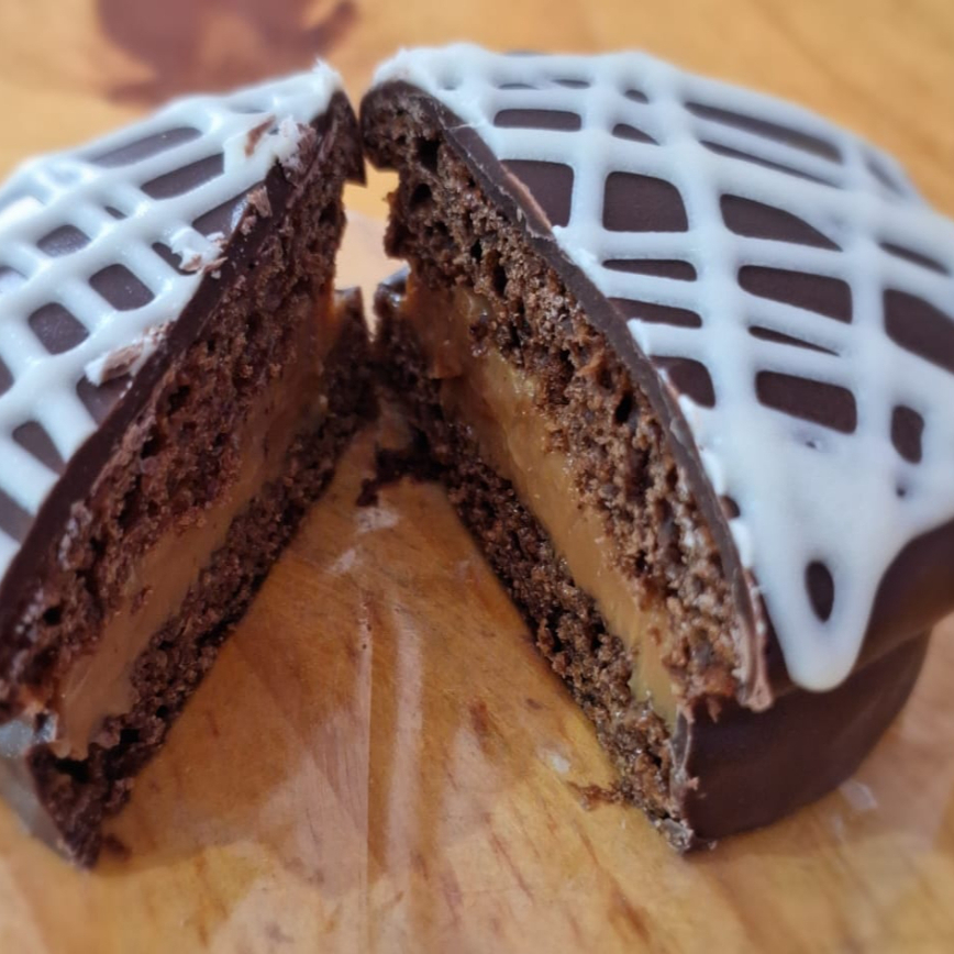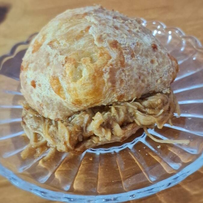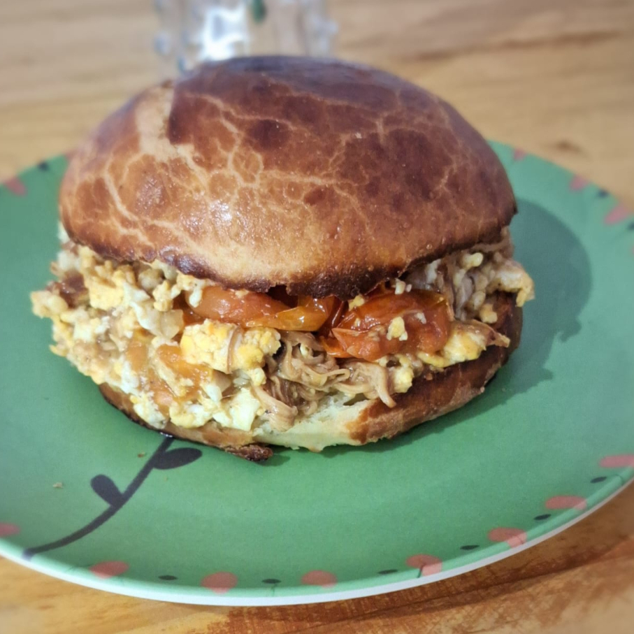 Brioche, frango desfiado,ovo, mussarela, bacon, tomatinho confitado e molho barbecue embalado a parte.