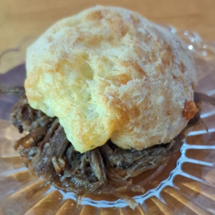 Brioche, costelinha desfiada,ovo, mussarela, bacon, tomatinho confitado e molho barbecue embalado a parte.