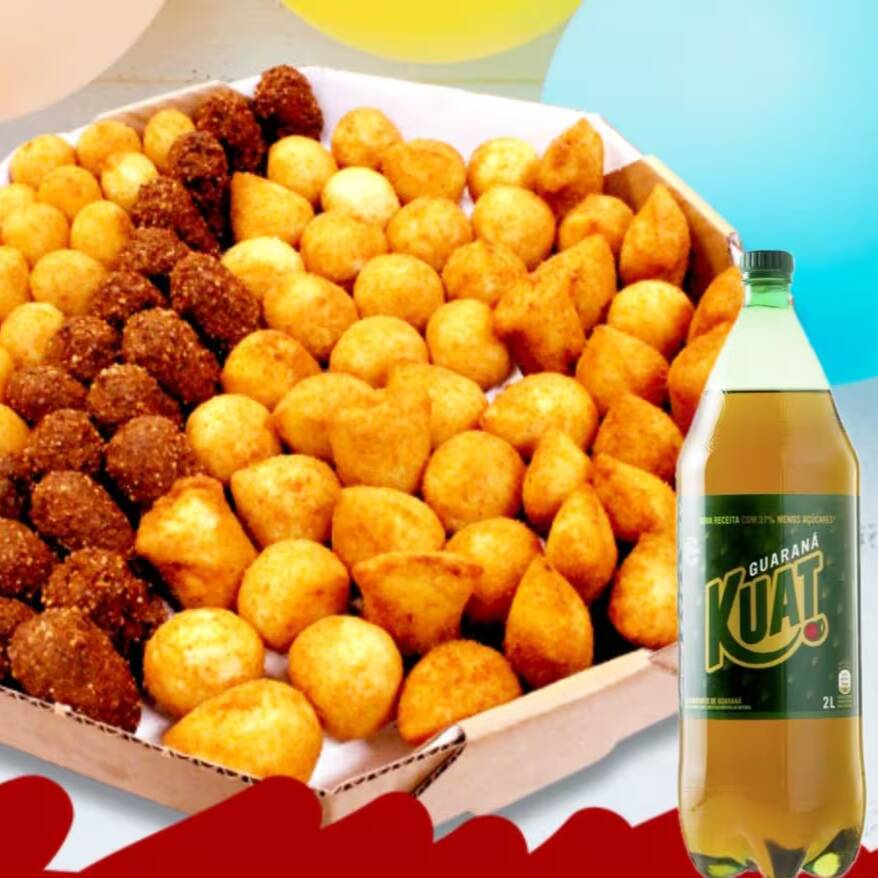 Aproveite 100 Salgados Artesanais + 01 Kuat de 2 Litros! Escolha Seus Sabores Favoritos ou Deixe a Seleção Por Nossa Conta. Fritos na Hora Para Máxima Crocância e Sabor!