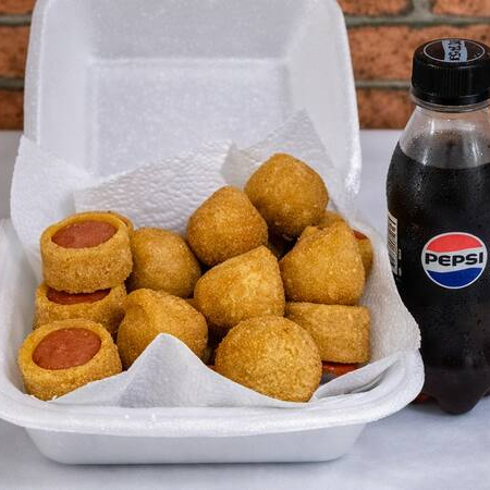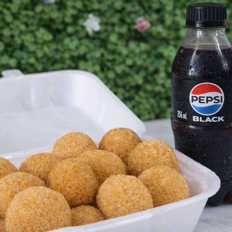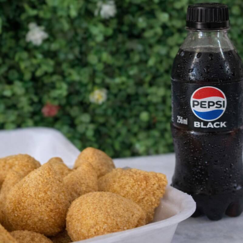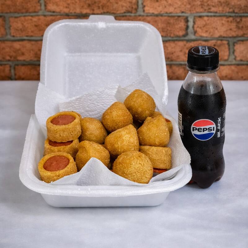 15 medalhões de salsicha + 10 coxinhas crocantes acompanhados de Pepsi geladinha.