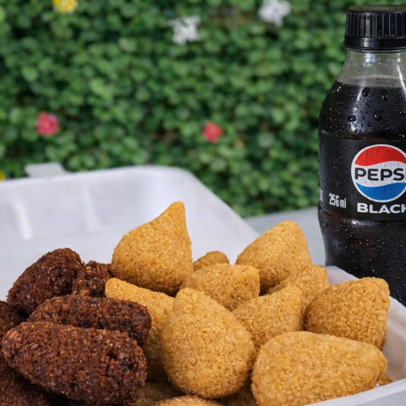 15 risoles de milho, 10 coxinhas e refrigerante 200 ml.