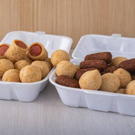 15 coxinhas, 10 maravilhas, 15 medalhões de salsicha e 10 risoles.