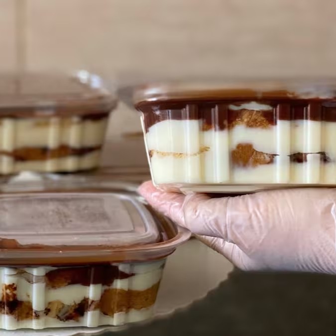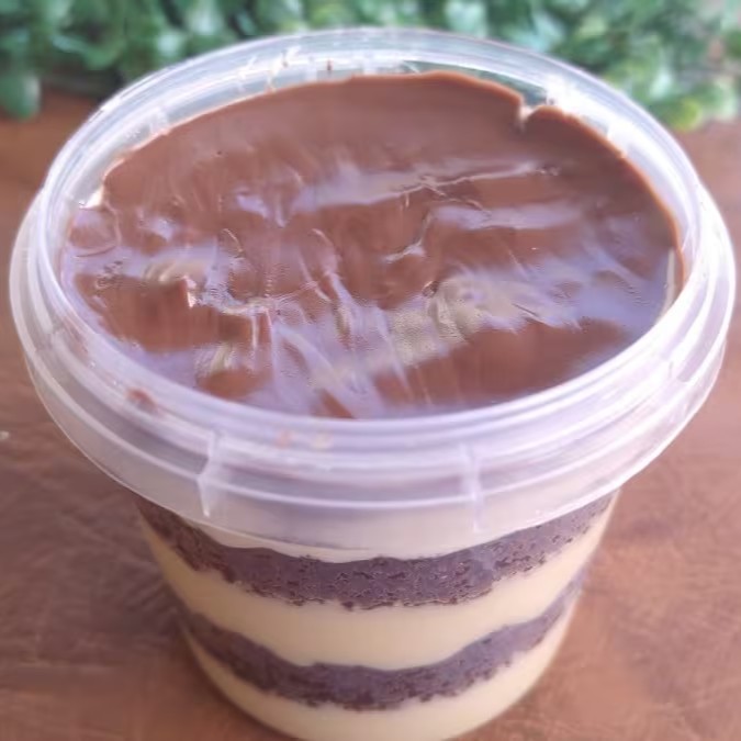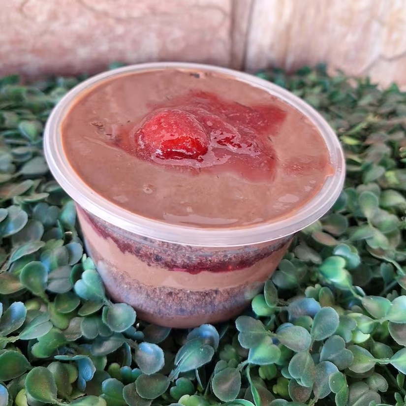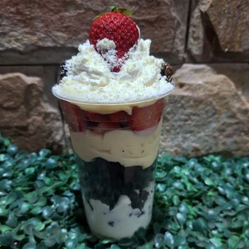 Mousse de Chocolate e Ninho Cremoso Acompanhado com Camadas de Brownie Fofinho e Uma Fruta de Sua Escolha Entre Morango ou Uva com Chantily Por Cima.