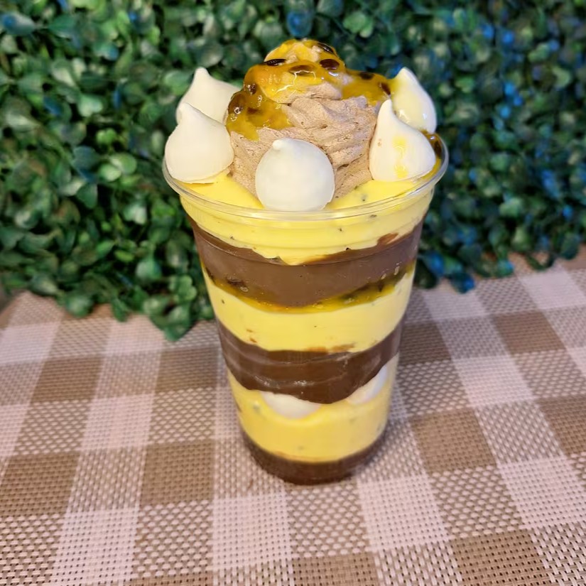 Delicioso copo de chocolate e Maracujá em camadas, geleia de Maracujá, suspiros e chanilly de chocolate