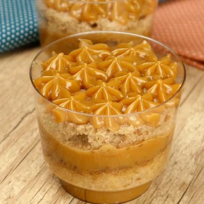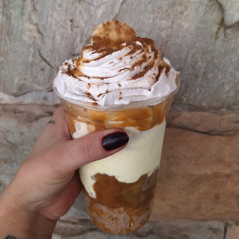 Delicioso Coo Feito com Biscoito Esfarelado em baixo, Creme de Doce de Leite, Creme de Ninho, Banana Caramelizada, Chantilly com Pitadas de Canela.