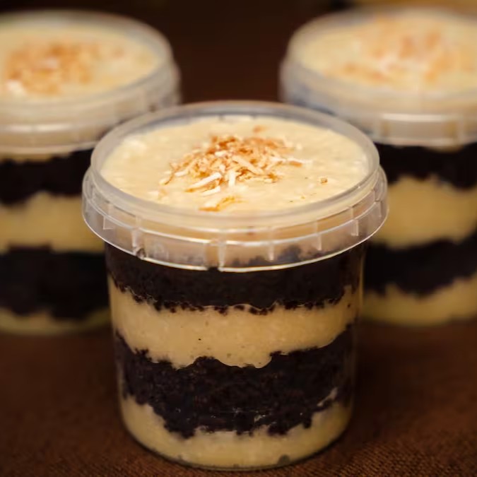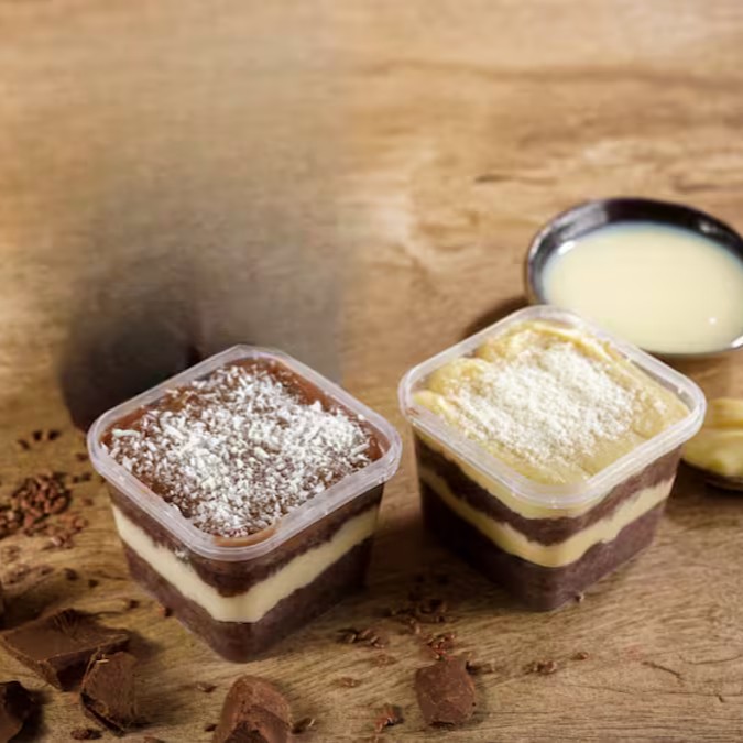 Brownie Fofinho e Molhadinho Com Mousse Cremoso de Ninho e Chocolate em Camadas, uma trufa a sua escolha.