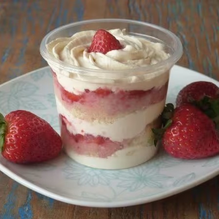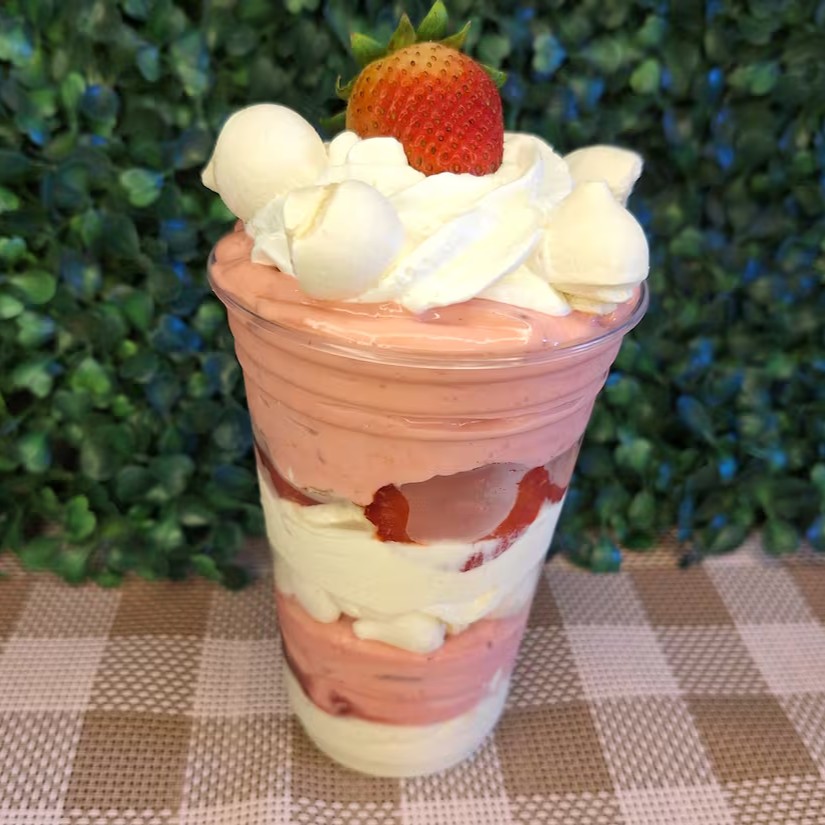 Um delicioso copo da Felicidade, com camadas de um delicioso recheio levinho de Ninho, recheio de morango com geleia, suspiros, morangos, finalizado com chantininho.