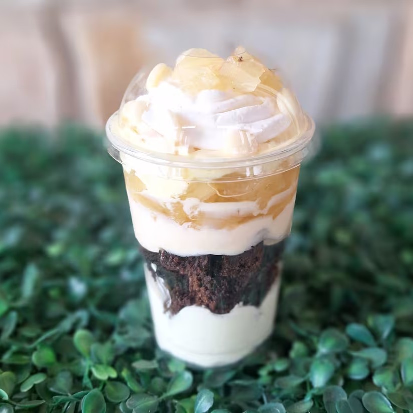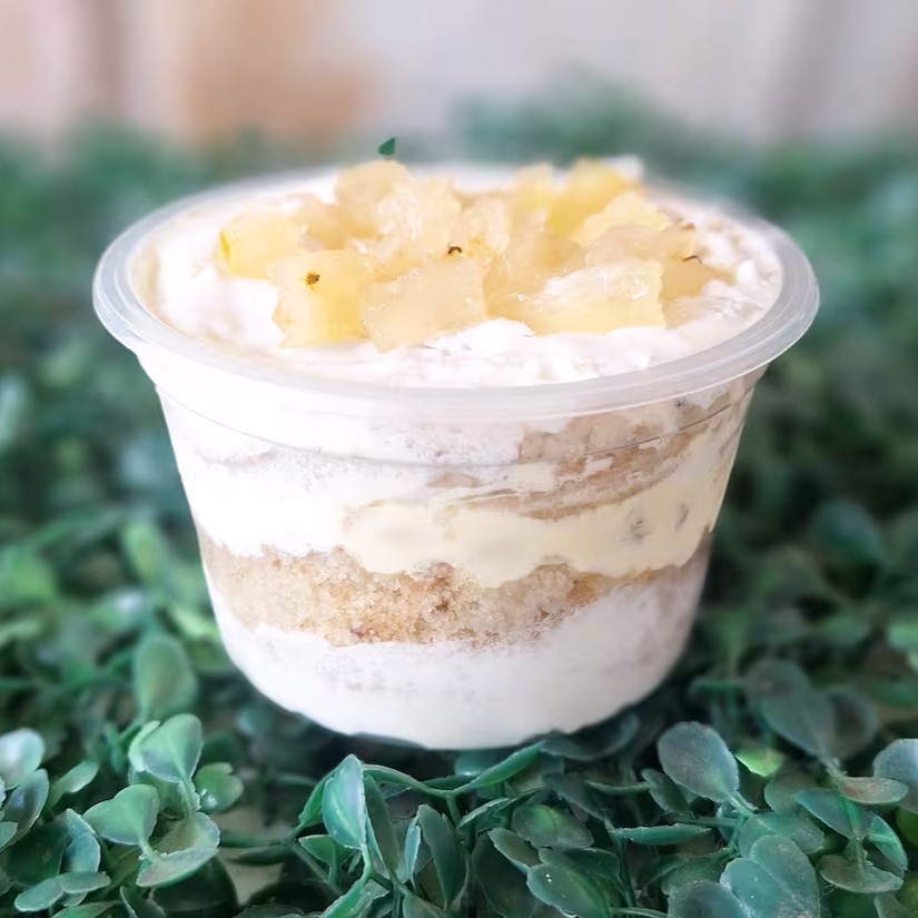 Delicioso copo nuvem de abacaxi, camada de creme nuvem de Ninho, com nosso maravilhoso brownie, recheio de Ninho, recheio de abacaxi com pedaços da fruta e finalizado com chantily e chocolate branco