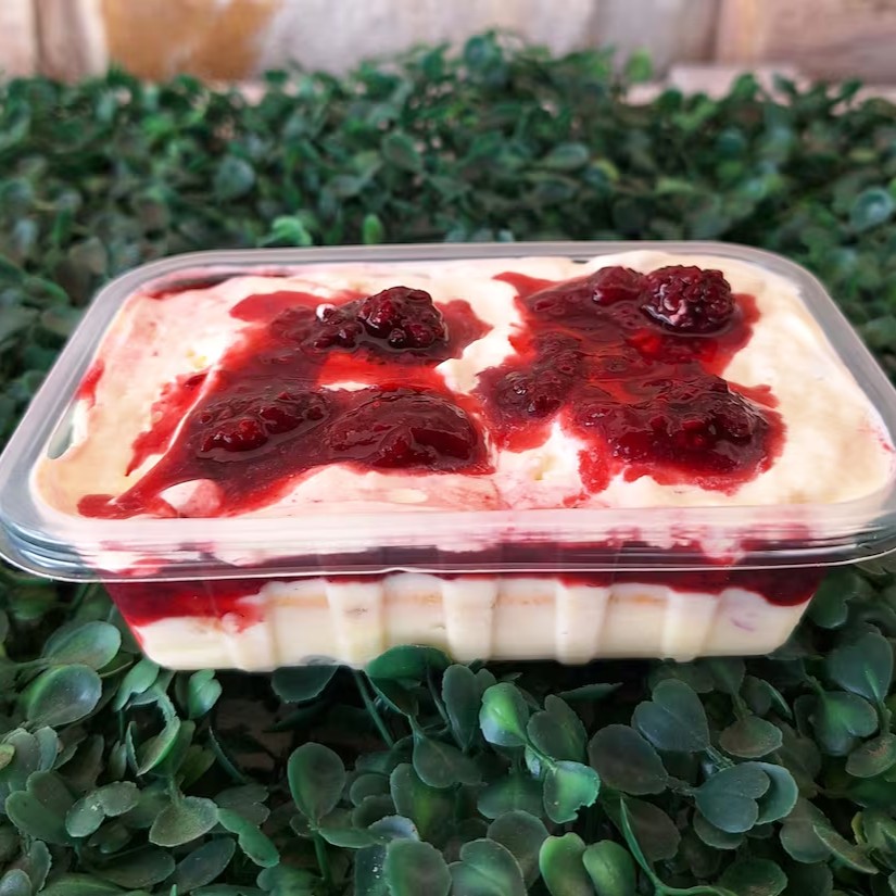 Delicioso pavê de Ninho com geleia de frutas vermelhas.