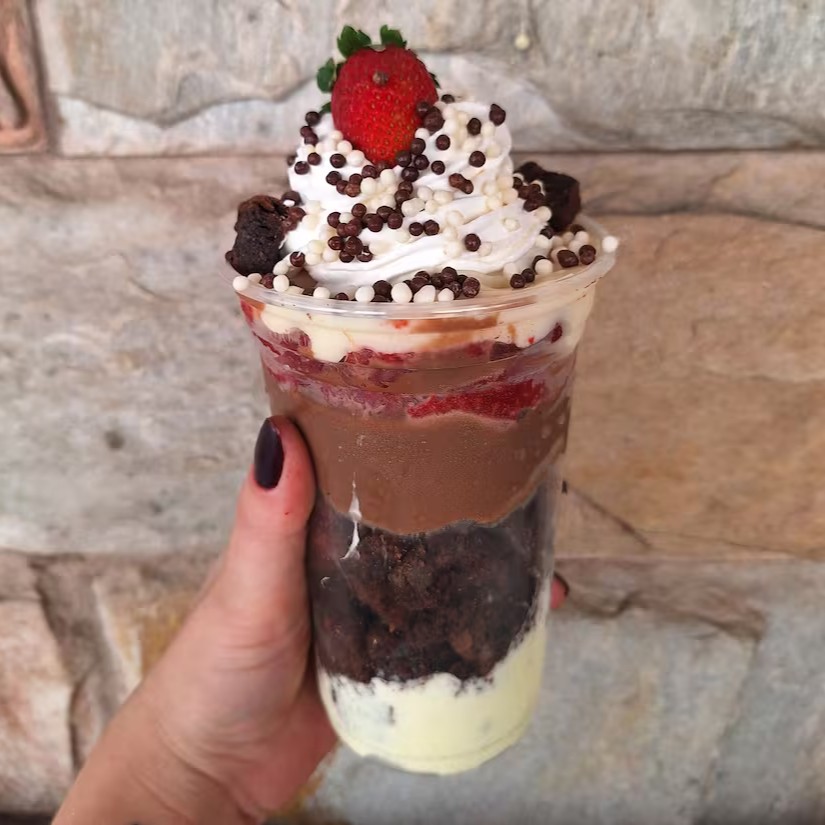 Delicioso Copo Feito em Camadas com Brownie, Mousse de Morango Recheio Cremoso de Chocolate Ao Leite e Ninho com Chantily Por Cima.