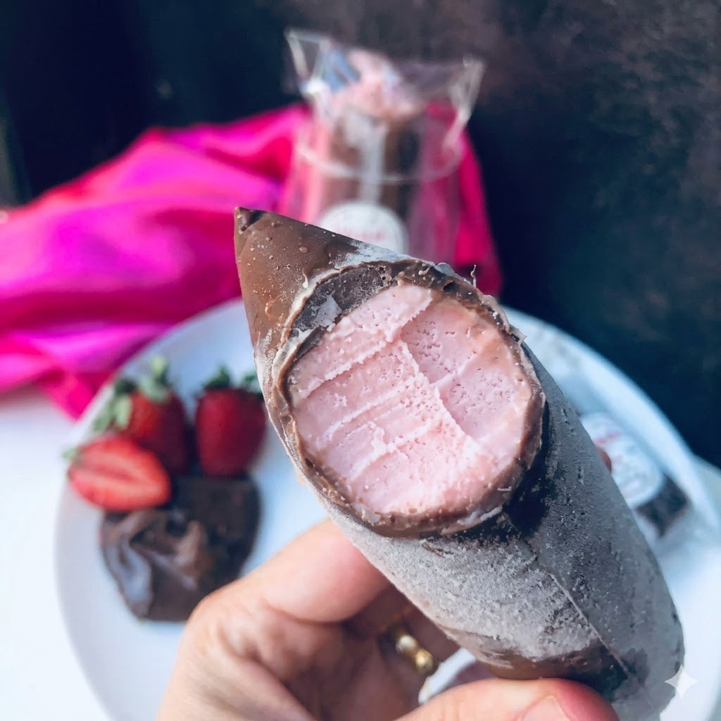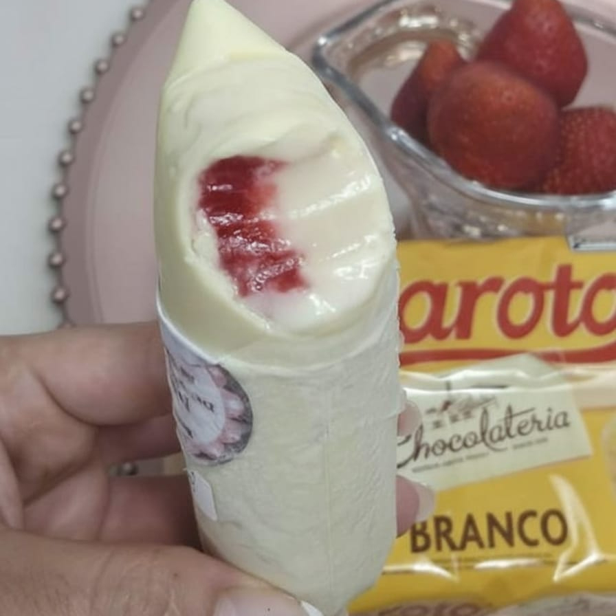 Recheio de Ninho cremoso, 20 gramas de Casquinha de Chocolate Branco e uma barra de geléia de Morango Artesanal dentro