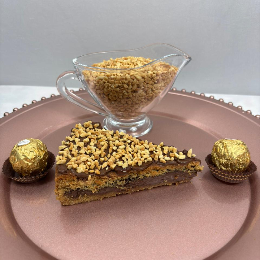 Bolo de Massa de Cacau 50%, Recheio de Nutella e Brigadeiro Tradicional, amendoim triturado e bombom Ferrero Rocher em cima
