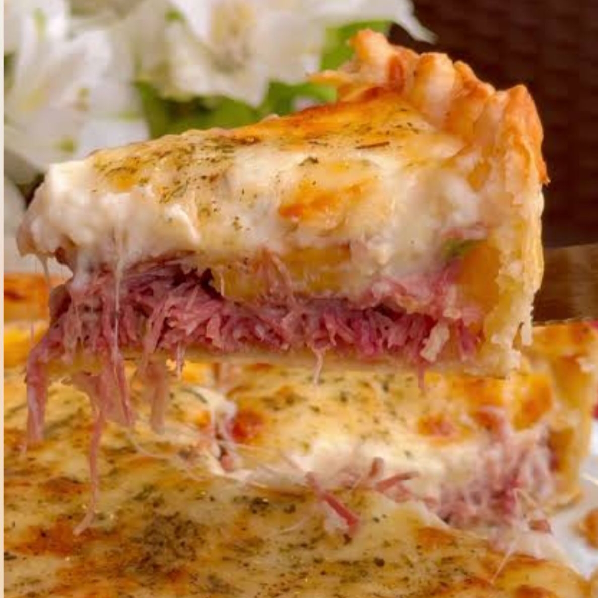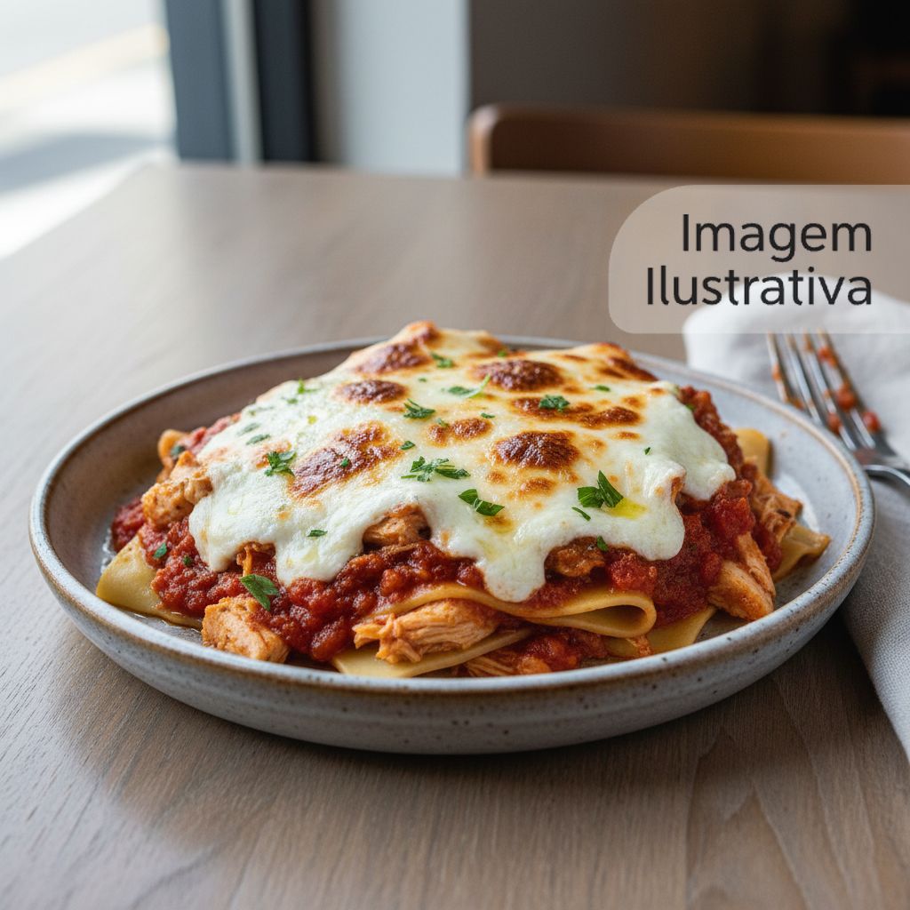 Deliciosa lasanha de frango desfiado com cremoso Catupiry e molho de tomate.