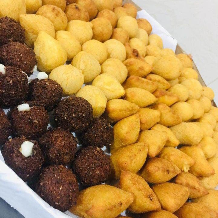 5 coxinhas, 5 bolinhas, 5 pastel de carne, 5 kibe recheado, 5 alho poro