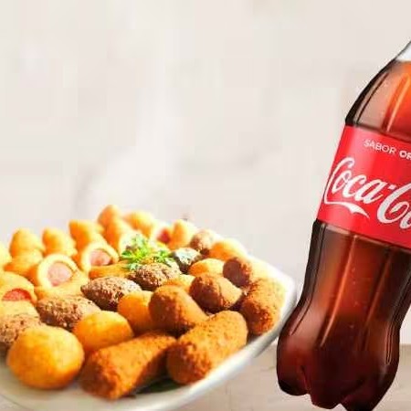 Combo com 30 salgados: 10 bolinhos de batata com queijo, 10 bolinhas de calabresa e 10 croquetes de carne. Acompanha Coca-Cola 600ml gelada. Ideal para compartilhar