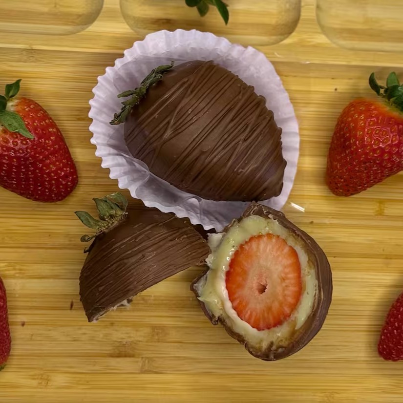 Morango suculento com recheio de chocolate Ninho, coberto com um delicioso chocolate nobre. O melhor bombom, em tamanho reduzido para comer aquele docinho e matar a vontade!