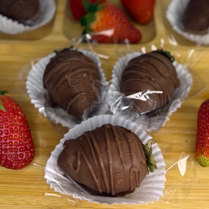 Três moranguinhos com recheio de chocolate Ninho cobertos com calda de chocolate nobre. Pequeno no tamanho, gigante no sabor! Ideal para matar a vontade, experimentar e dividir com aquela pessoa querida!