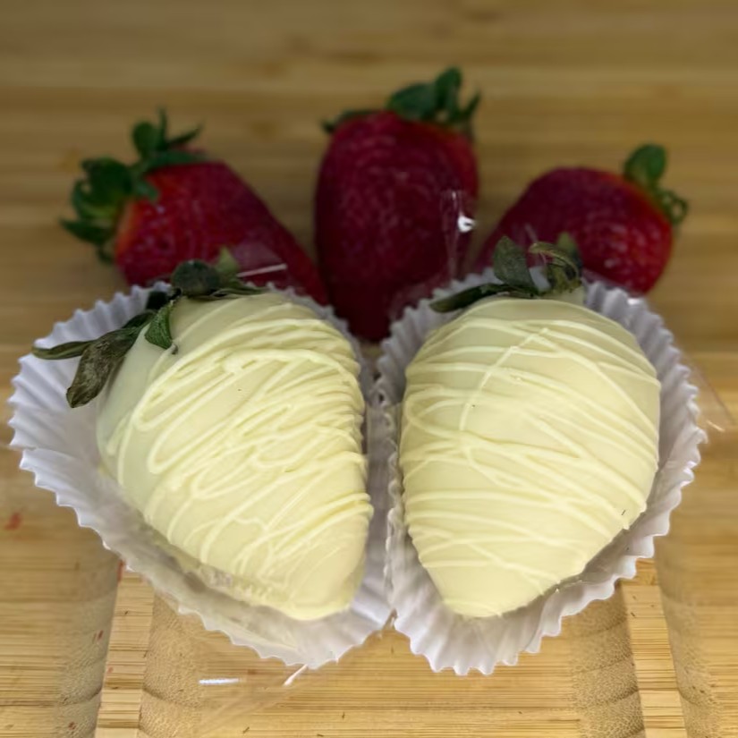 Dois moranguinhos com recheio de chocolate Ninho cobertos com calda de chocolate Branco nobre. Pequeno no tamanho, gigante no sabor! Ideal para matar a vontade, experimentar e dividir com aquela pessoa querida!